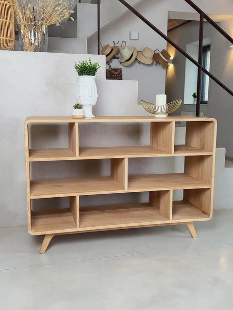 Mit den Maßen 130×45×89 cm bietet das Regal acht offene Fächer – kompakt, aber überraschend geräumig. Ideal zum Ordnen von Büchern, zum Präsentieren von Deko oder zum Aufbewahren alltäglicher Gegenstände.